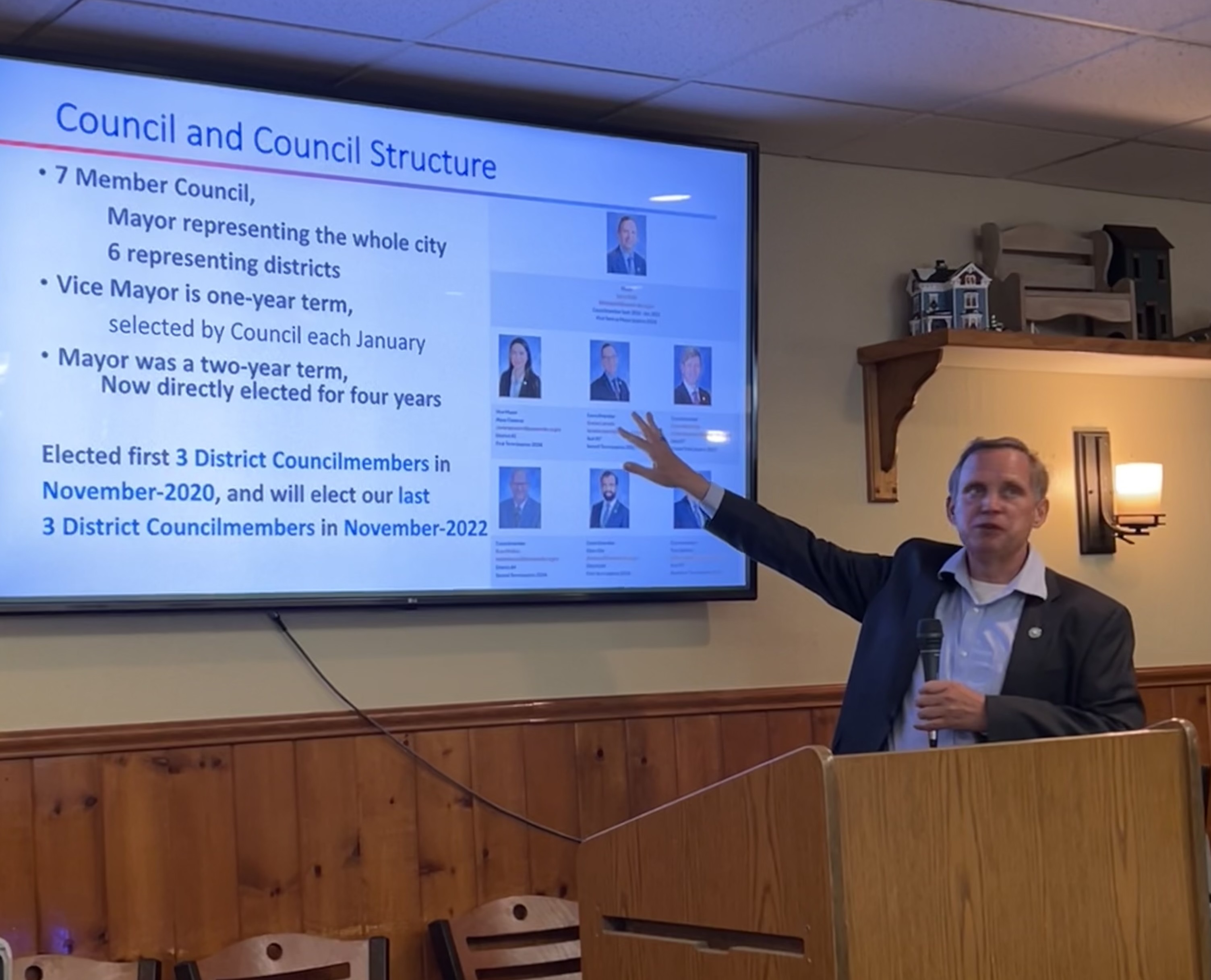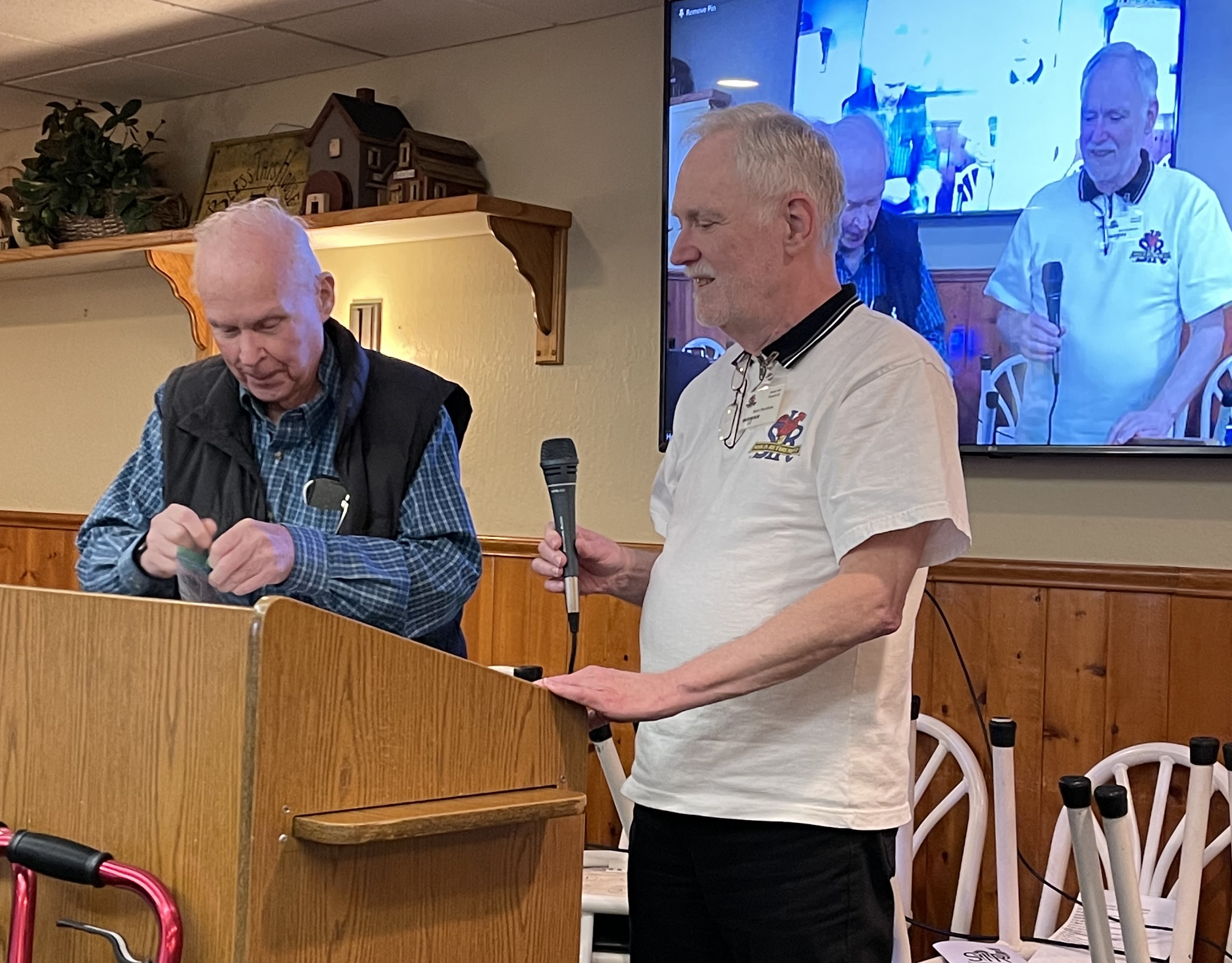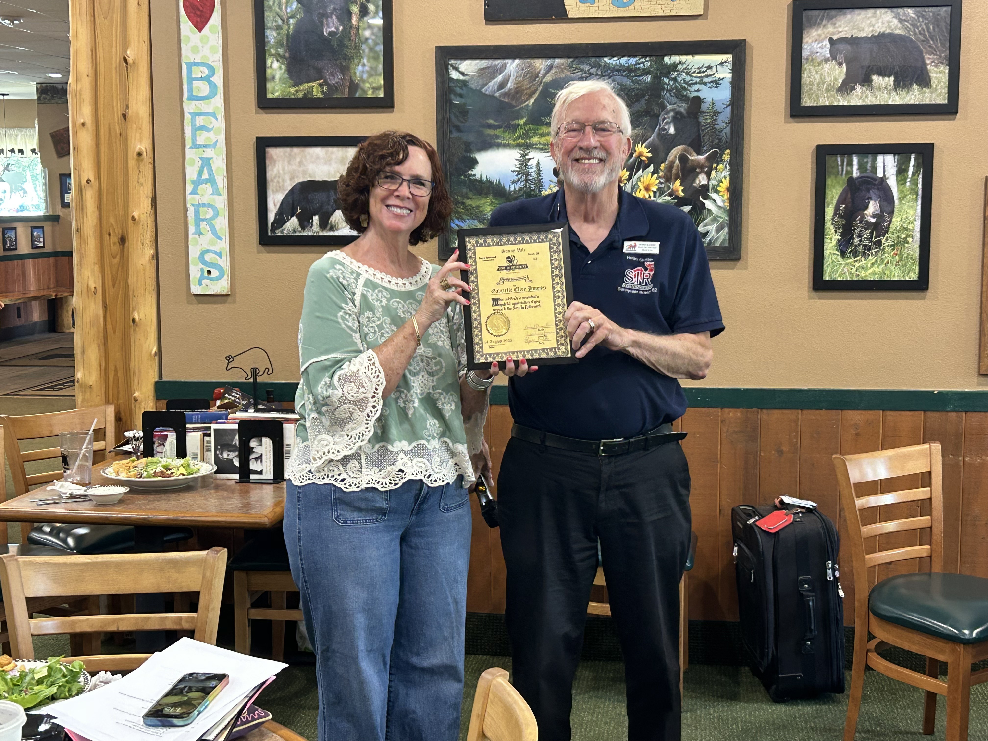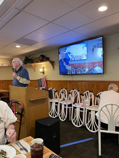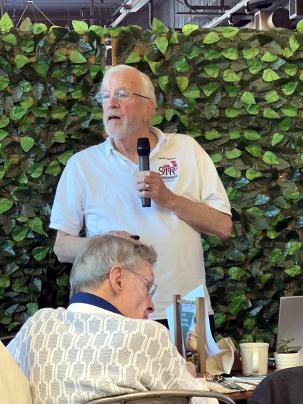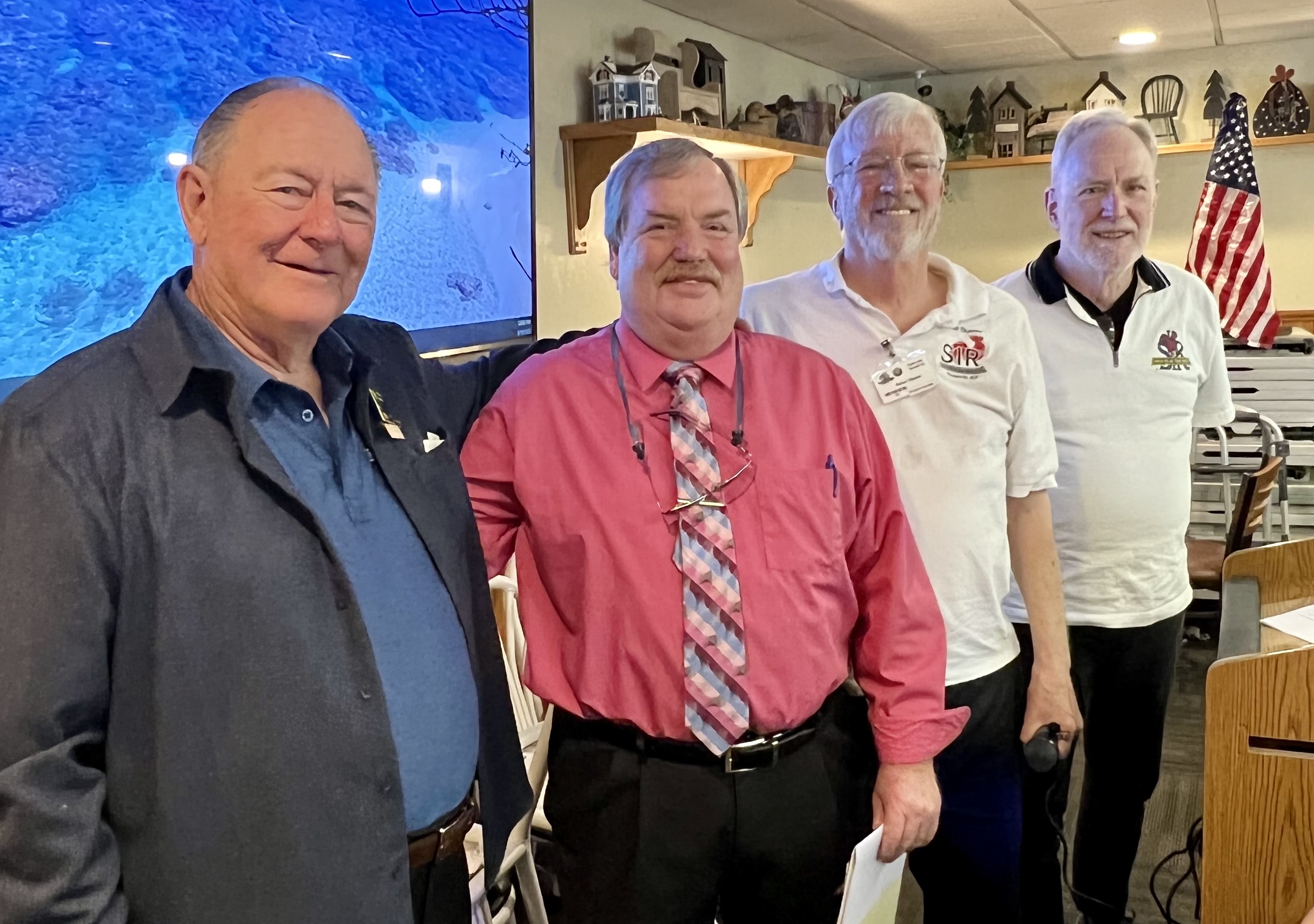 Pledge of Allegance, followed by reports from each of our SIR activities, some humor, and other business including a celebration and prize drawing for birthdays each month (you must be present to win). While enjoying our lunch, we hear a presentation from our guest speaker.